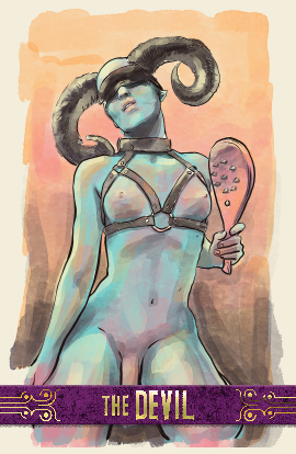 The Devil symbolizes the sexual as spiritual: physical and material experience that connects to something more profound. The devil shows us bondage, being trapped in service to the material or physical. It's meanings include being in servitude to something, indulging the darker side of yourself, and the feeling (not reality) of having no alternatives.