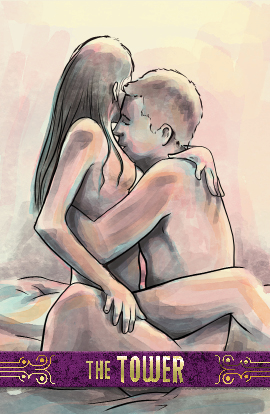 The tower is a card of sudden change. The tower will come apart, the feelings between the figures have already changed. Its meanings include the sudden change of an established situation, the end of a relationship, a time of upheaval, and a flash of insight.