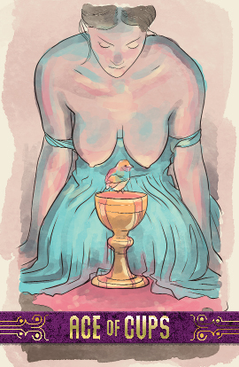 Inspiration, gifted or divine, in the suit of Cups. The Ace shows the deep wells of emotion and intuition available to the seeker. The waters of this overflowing cup take in experiences, friendships and romantic relationships, and gift insight and patience.