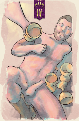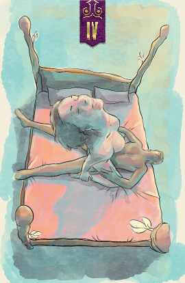 Two people celebrate together in the four of wands. The four-post bed they occupy is supportive but open, not restricting them in any way. This card can symbolize freedom and love of life.