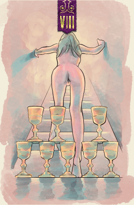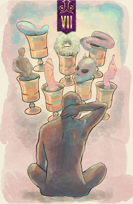 A wealth of physical and material pleasures are before us in the seven of cups. Which will we choose? Would any of these options provide meaning or depth of feeling beyond the moment?
