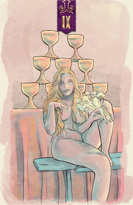 The nine of pentacles is a celebration of accomplishment, of work well done. Perhaps there is more to do and gain, but the rewards are worthy of enjoying.