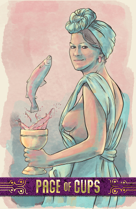 The page of cups is ready to explore the depth of emotion and intuition. They stand confidently, cup full of the wine of experiences yet to taste. The leaping fish often represents imagination, the wonder with which they explore their passions.