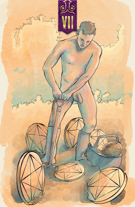 The seven of pentacles shows the rewards of hard work paying off. But the work is not yet complete. Draw strength from what you have accomplished.