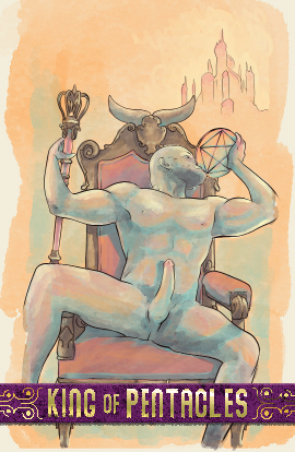 The king of pentacles possesses many types of wealth. He is sated, confident, and has much to share with those around him. His bull-like qualities make him stubborn.