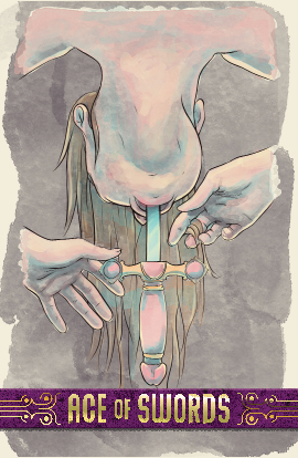 Inspiration, gifted or divine, in the suit of swords. The Ace shows the sharp spark of spirit and wisdom available to the seeker. This clarity can part through emotional turmoil, gifting new vision on conflict or difficulty.