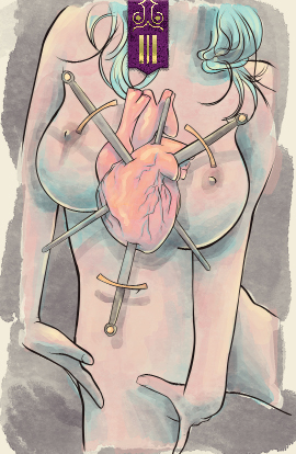 The three of swords shows the deeply painful side of swords as they have pierced the heart. This card represents a harmed relationship, sorrow, and loss--deep emotions that must be accepted and worked through in order to emerge on the other side.
