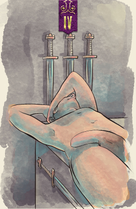The four of swords represents withdrawal from the world, a moment of rest. The figure does not appear to be resting peacefully, but has withdrawn to put down their swords, to get away from conflict.