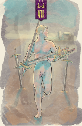 The figure in the seven of swords has taken action to handle their struggles, but must leave something behind. They look back, pleased at what they've accomplished but perhaps watching for pursuit. The card represents action taken against a problem that is not satisfying or does not solve the problem.