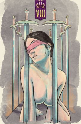 The eight of swords shows a person who is trapped. However, on second look, there are large spaces between the swords and their hands are not bound. They can escape their situation if they choose to. The blindfold keeps the figure unaware of their options.