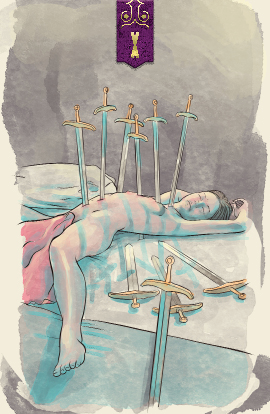 The ten of swords shows feelings of pain or suffering that outweigh the situation itself. The swords rest in the body bloodlessly and there are far more swords than needed to kill someone. The person experiencing the ten of swords may feel that their problem or situation is worse than it actually is.