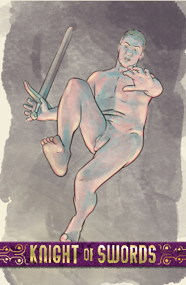 The knight of swords is the knight most in action. Caught in the moment of striking, they are filled with their emotions, having already made the decision to be in conflict. This knight is eager for battle, but will tire easily as they are still not as mature or experienced as the king or queen.