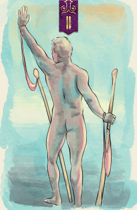 The two of swords shows a figure echoing justice, with eyes blindfolded and swords held tensed and ready for action. They hold the balance for a moment but would strike at any danger or uncertainty.