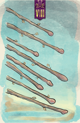 A card that represents movement in a suit that embodies action, the eight of wands shows wands striking rapidly toward their earthly target. The card suggests taking swift and focused action in a project or in love.