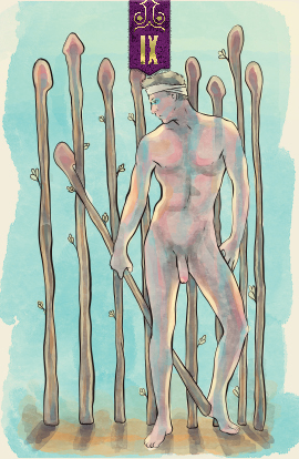 In the nine of wands, the figure pauses with fatigue as they have been in battle. They are weary and injured, but their conflict is almost at an end. The card suggests that we keep struggling toward our goal, but cautions that our vision may be compromised.