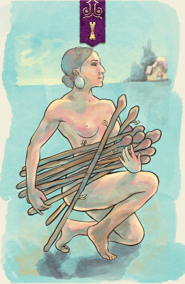 The figure in the ten of wands is burdened with all that they must carry. Because they constantly take on new projects and conflicts, they now have the heavy responsibility of everything they have committed themselves to. They need to find the other options available to them for managing their problems.