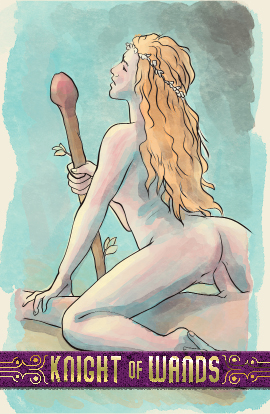 The knight of wands acts in pursuit of their pleasure, exercising control they have learned from experience wielding the fire element. But the knight is not all about control, they are about the excitement and the adventure of pursuit.