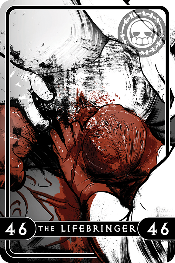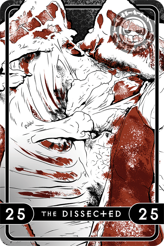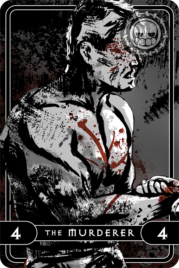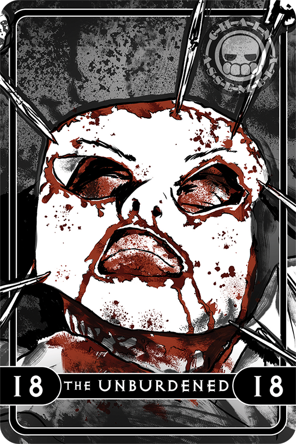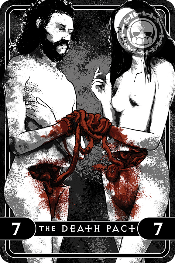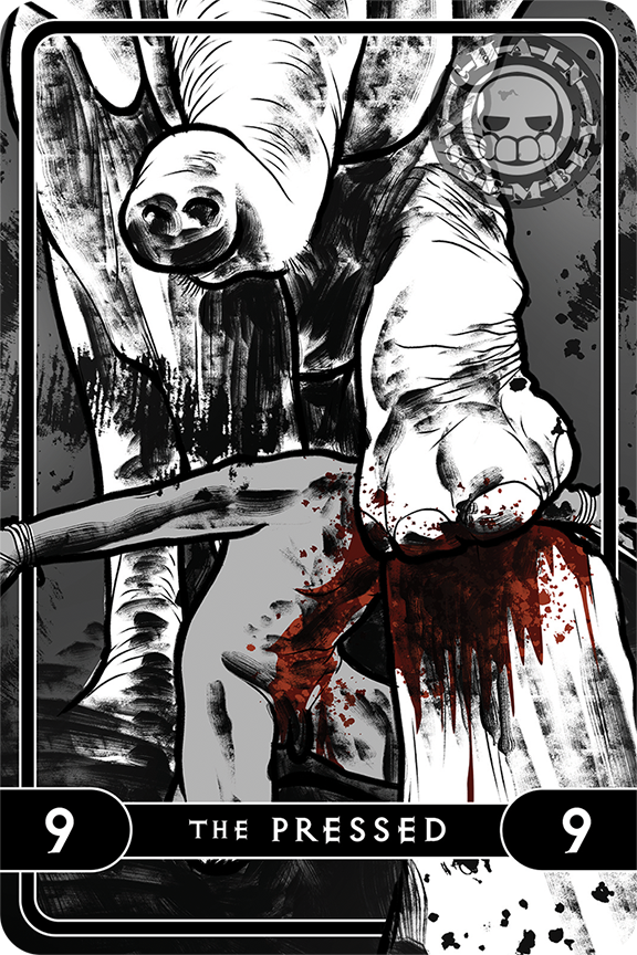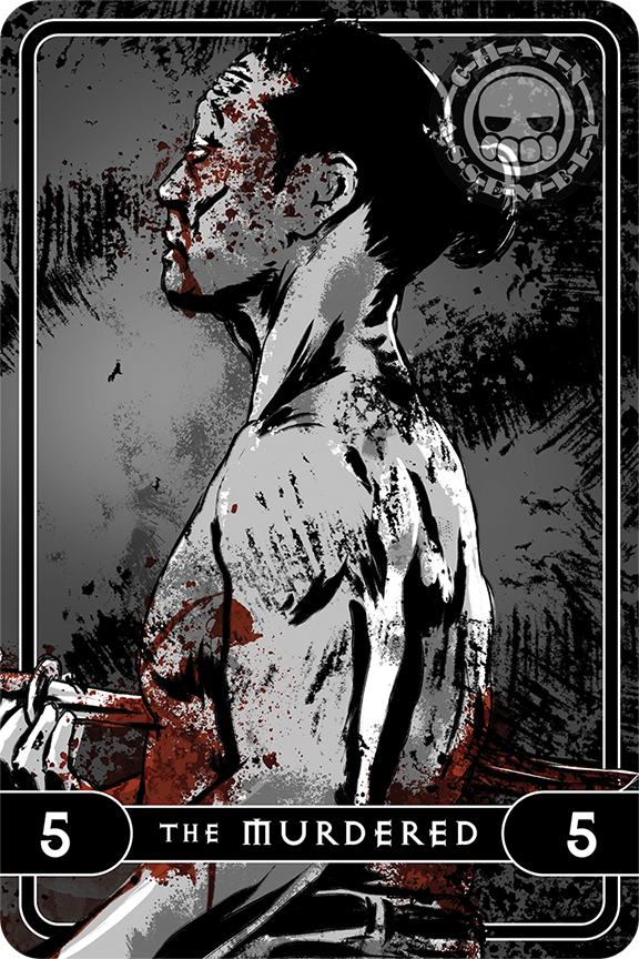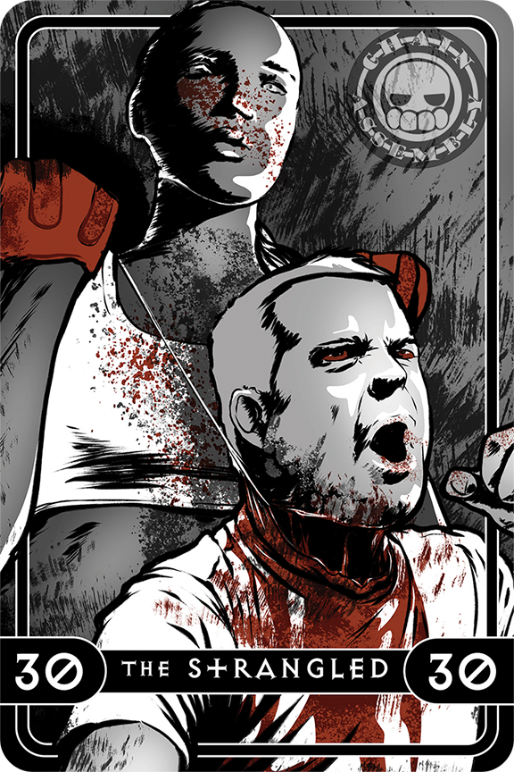This card was designed during a period when I was thinking of forms of death first and designing the meanings separately. Choking lead to a garrote wire, which lead to the split throat, which became this card.