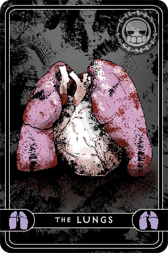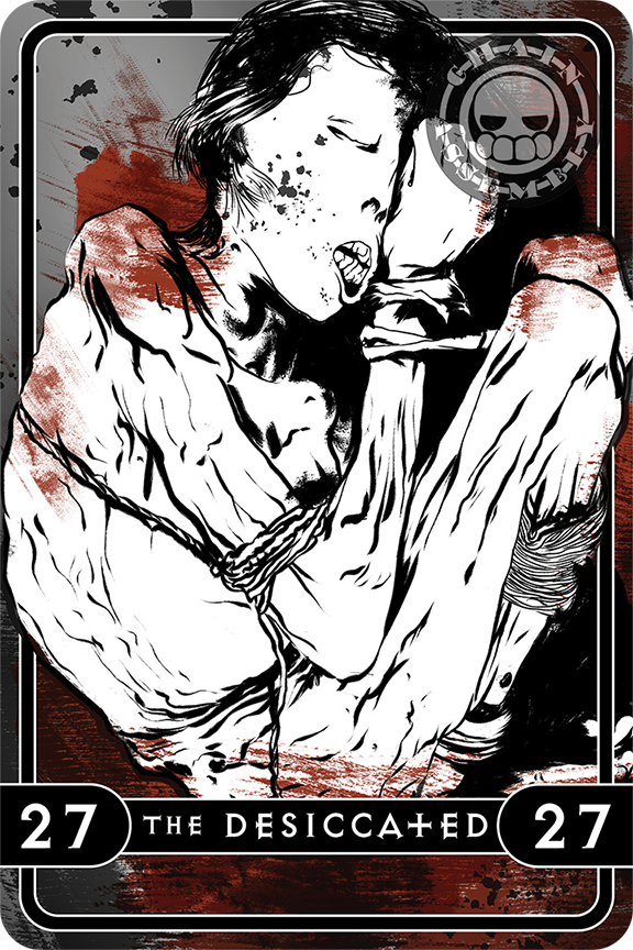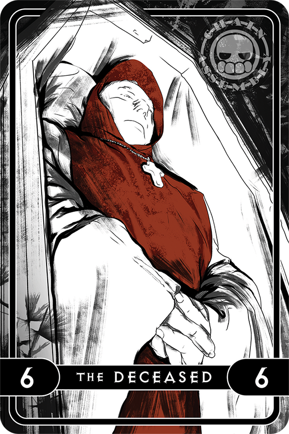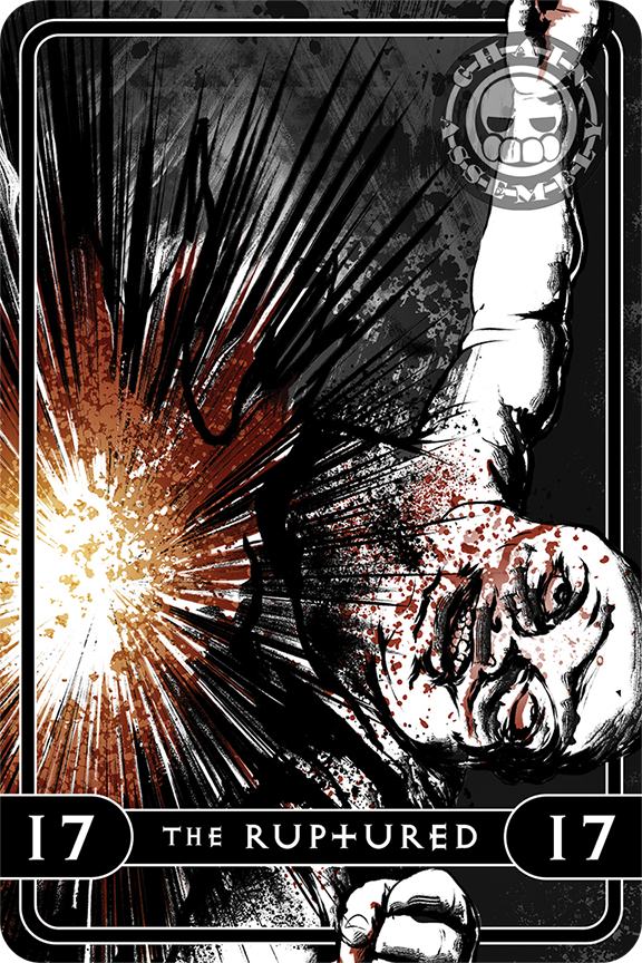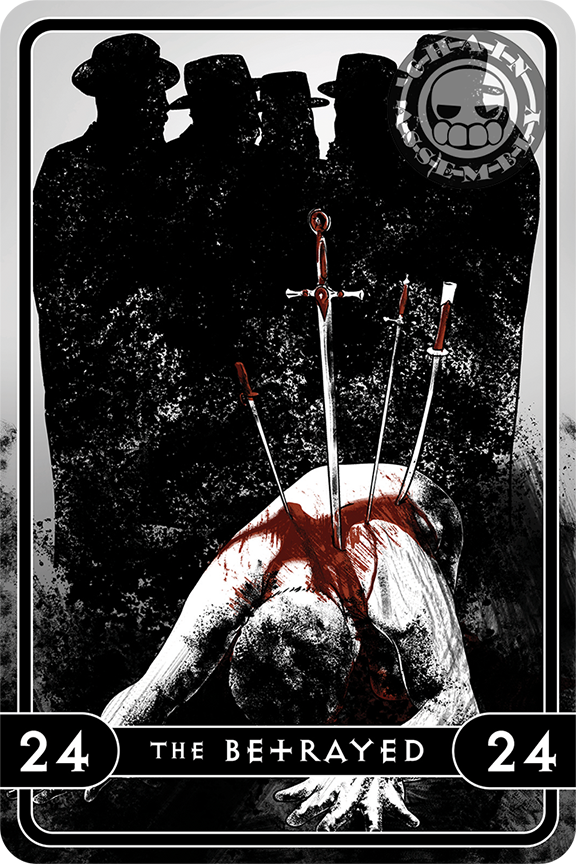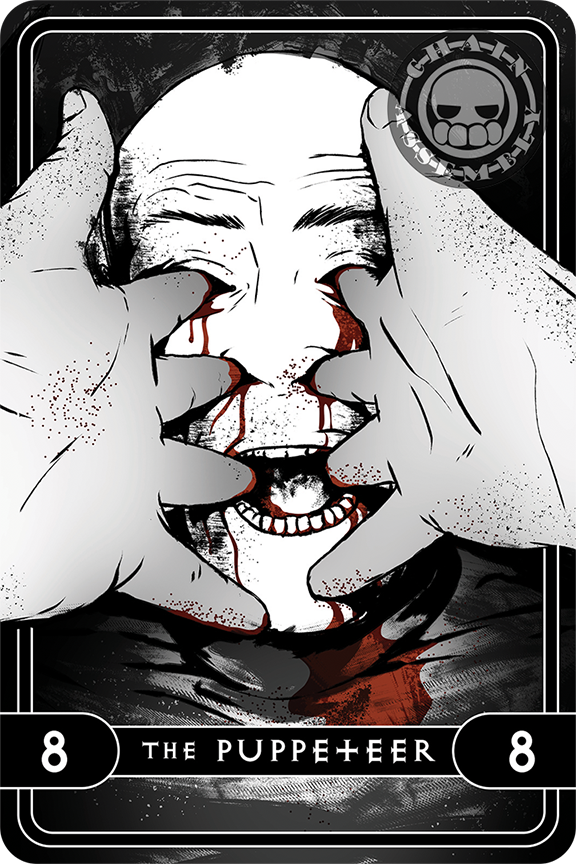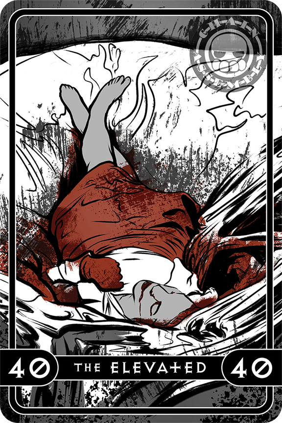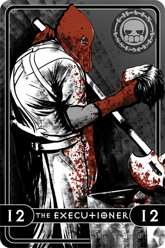 This card was designed during a period when I was thinking of forms of death first and designing the meanings separately. Choking lead to a garrote wire, which lead to the split throat, which became this card.