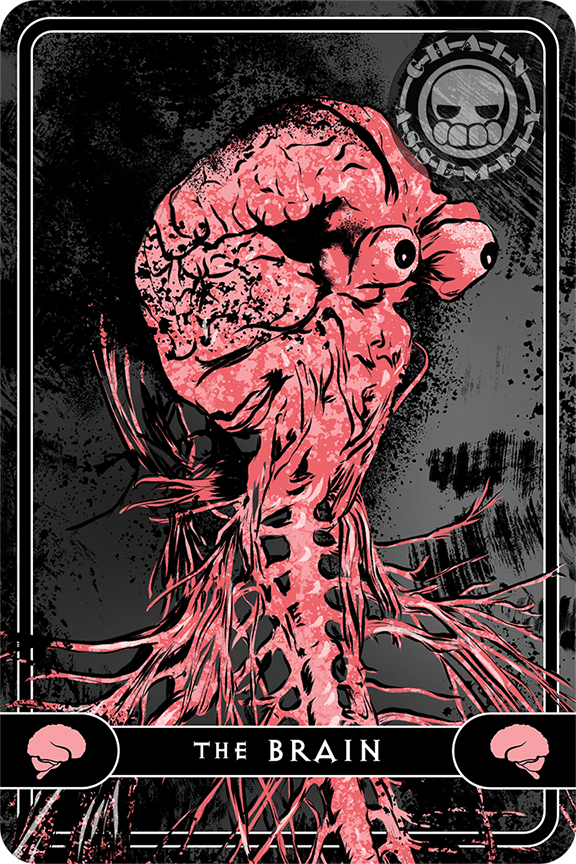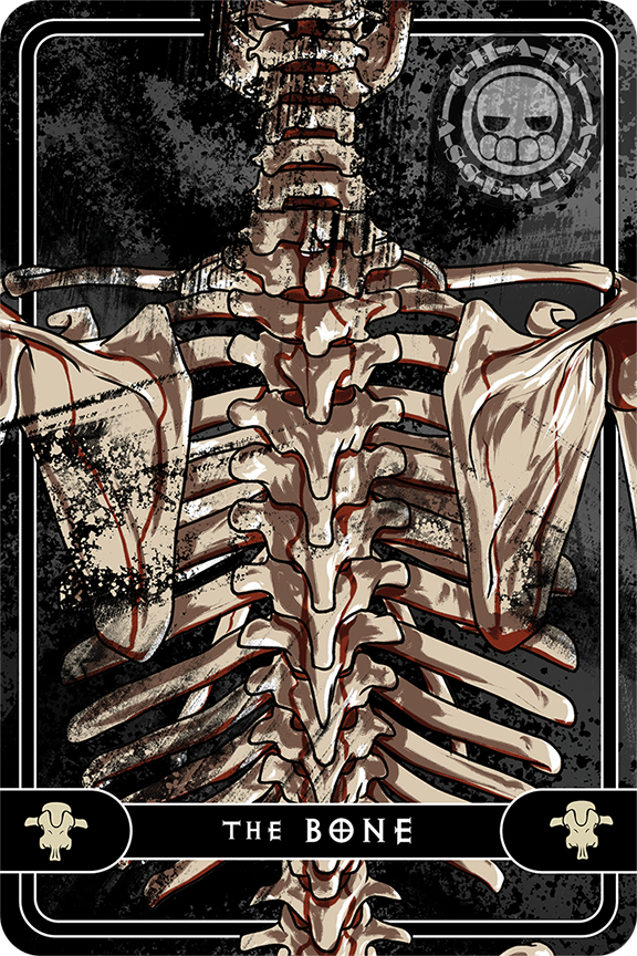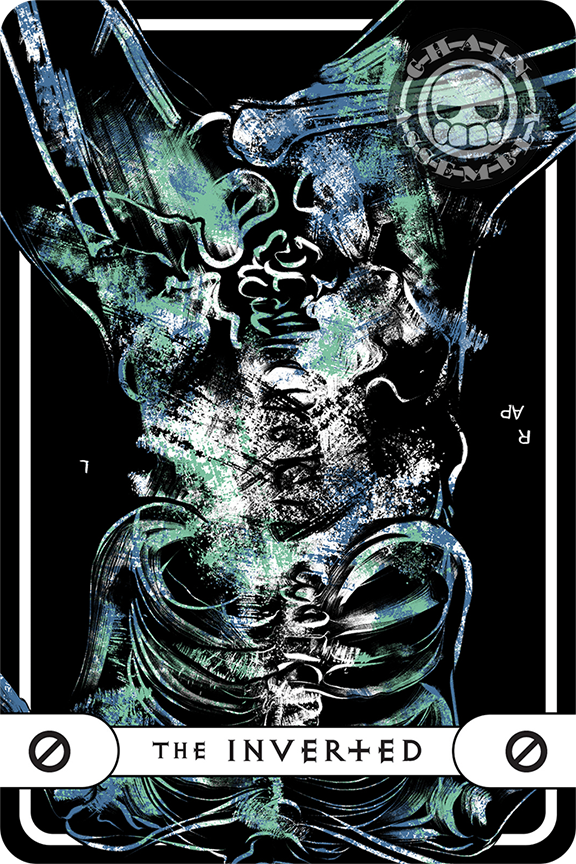 The idea for "The Inverted" was first and foremost to have a card that inverts those around it. Therefore, I also had to invert my color scheme and draw white upon a black background. I combined a few gruesome x-rays for the reference of my drawing. Because of it's special place in the deck, I decided to also make it numbered 0.