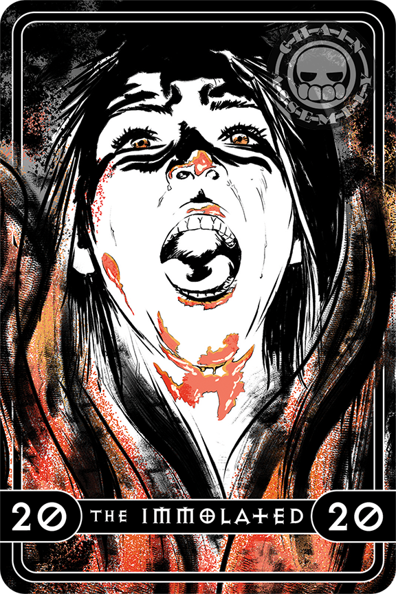 Another early illustration, I was inspired by Helen being burnt alive at the end of Clive Barker's "Candyman." I wanted to see the fatty tissue as her skin dries out and shrinks away from the layers beneath. This card also gave me the idea to have certain cards affect the meaning of those around them.