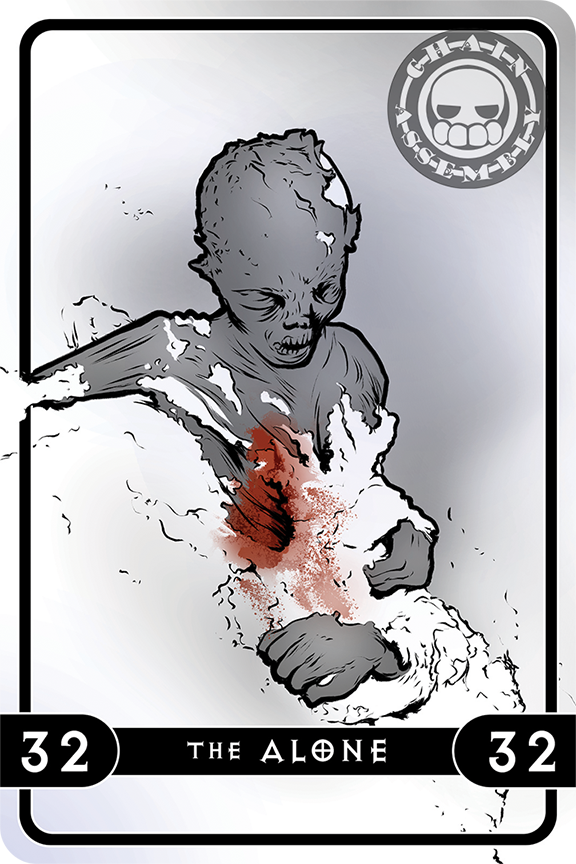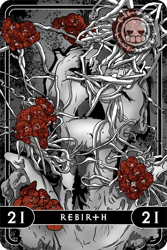 This card was originally called The Transformed. I wanted to illustrate someone who bones are shifting and changing while their skin remains intact. The illustration ended up looking pretty dumb, so I rethought the idea of transformation and took it to mean the life that grows from our remains. I then used that tile for another card and rewrote this one as Rebirth.