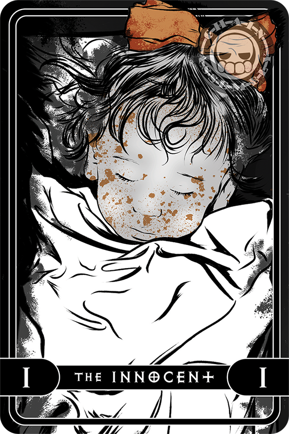 Inspired by Tarot cards such as the fool and the 7 of Cups, I wanted to have something that represented childhood, innocence, and longing to return to your past. What made the most sense within the parameters of this deck was to honor Rosalia Lombardo, a famously persevered corpse of a child who died from Spanish Flu in 1920.