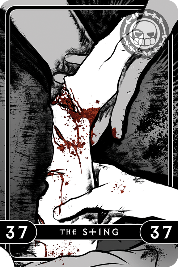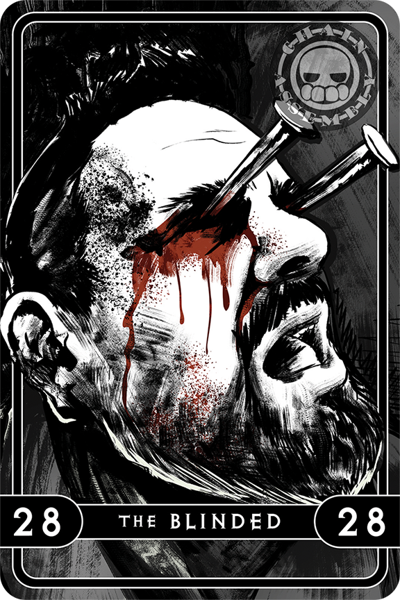 This card was inspired by the knifing scene in "Green Room." I had a visceral reaction to that moment, more than any other gory scene in recent memory, and this one wasn't even that bloody. The presentation of many shallow cuts was what triggered my empathy, so I wanted to commemorate it with this card.