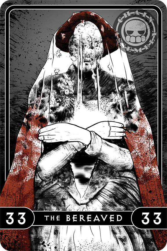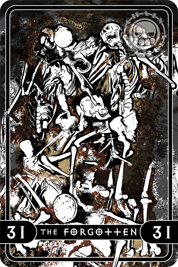 I thought a card that hinges on the reader having forgotten something is a pretty safe bet. For the image I wanted a pile of unearthed bones. The idea being that an event of immense tragedy and violence will always be forgotten to time, no matter how much it affects those contemporaneously.