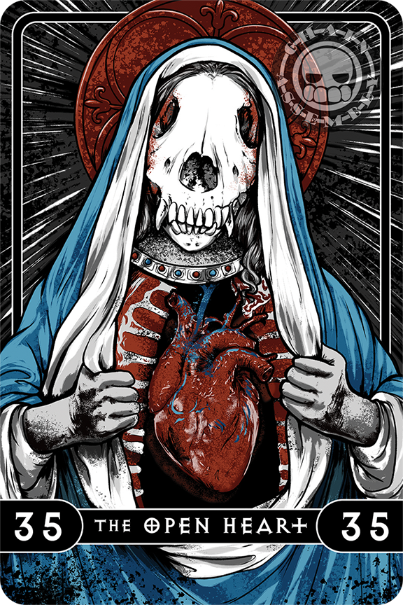I wanted a counterpart to The Open Mind, and The Open Heart just made so much sense. My college thesis revolved around Mexican Santos figures, so some of that imagery crept up here, replacing a stylized heart with the art from "The Heart" card and replacing the Virgin's face with a dog's skull as a symbol of loyalty and unconditional love.