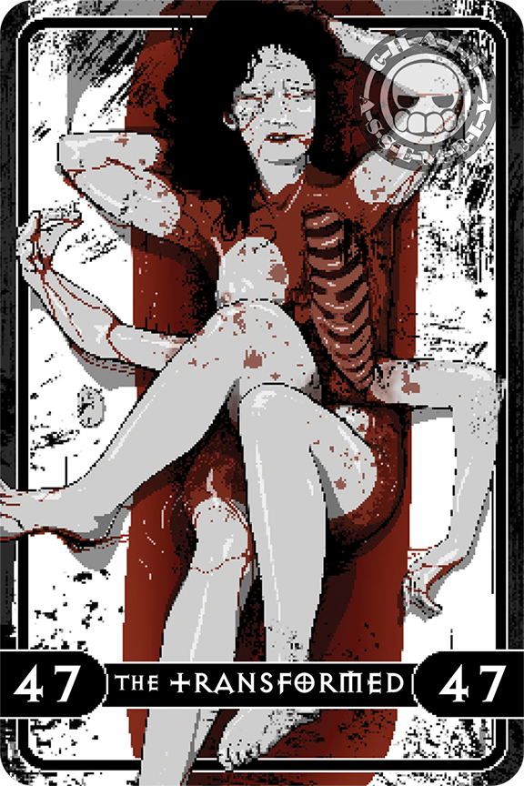 The Transformed was the original title for the card that is now called Rebirth. When I had the idea for this image of a woman crawling out of another woman's body (inspired by a scene in "Poltergeist 3"), I thought it would be a better representation of that title.